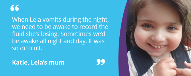 These complex needs are extremely difficult for any family to manage, but surviving on just four hours sleep a night, Katie and Tom knew they needed specialist care and support for both Leia and themselves. Leia’s mum, Katie, told us, “When Leia vomits during the night, we need to be awake to record the fluid she’s losing. Sometimes we’d be awake all night and day. It was so difficult”.
