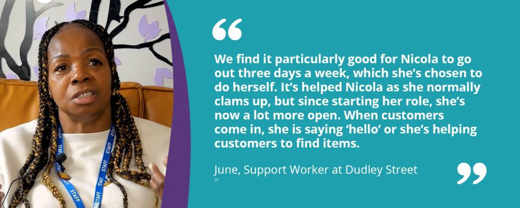 Despite initially feeling very much out of her comfort zone, Nicola now works at the shop three days a week. Having a regular job in the community has improved Nicola’s independence immensely and has helped her to interact with others.