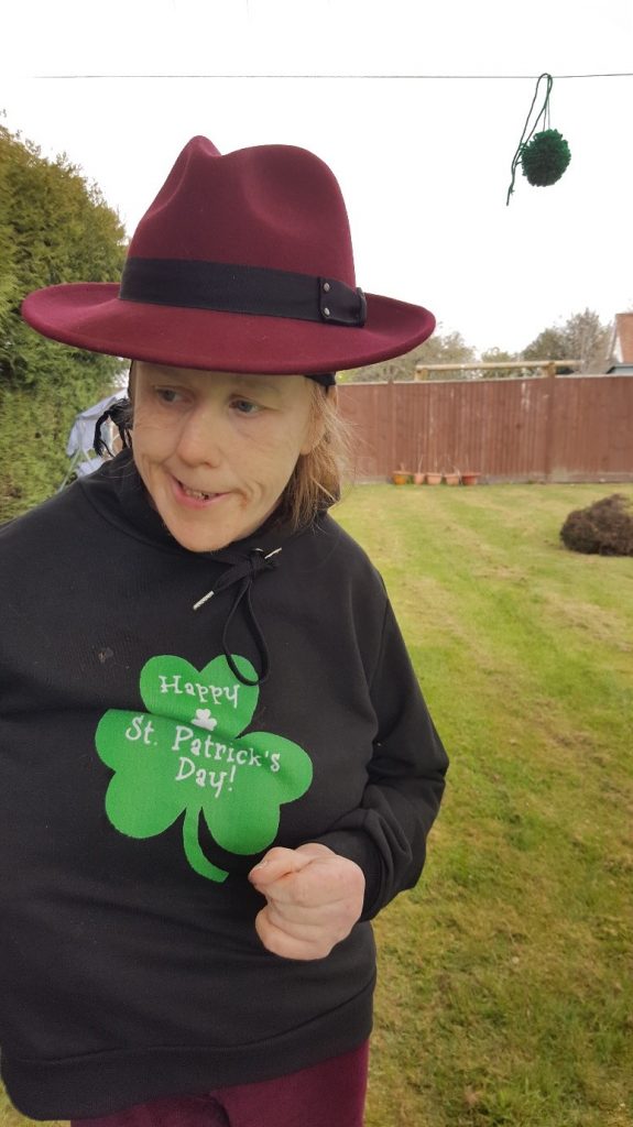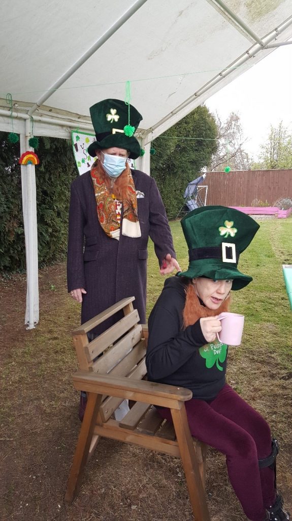 After months of not being able to see her dad in person, it was finally safe enough to plan a garden visit! Helen was keen to celebrate a belated St Patricks Day with him. It had been over a year, but Helen finally got to see her dad. Everyone at the service knew how much it meant to Helen and helped make Irish themed decorations. They got creative making green pom poms and even made them own shamrock potato stamp for the posters they attached to the gazebo outside.