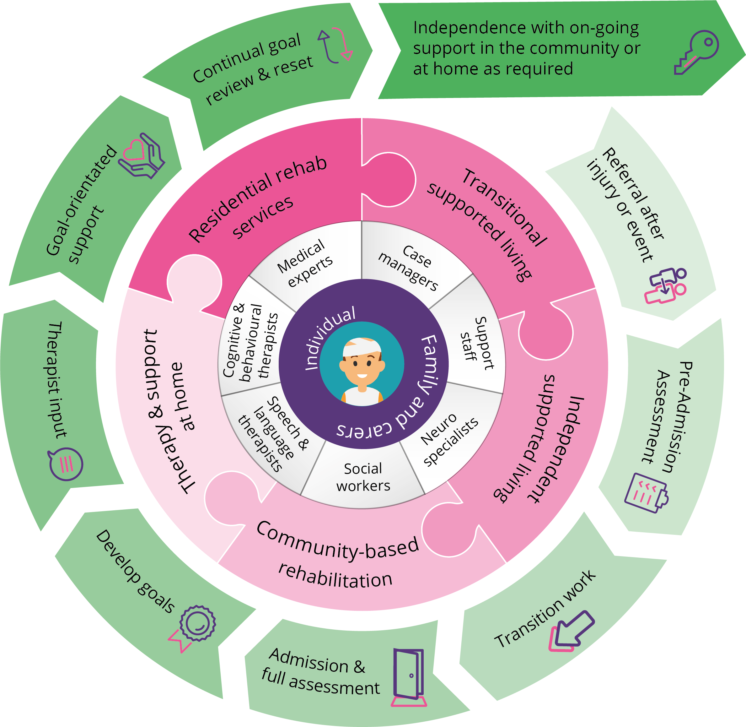 We work intensively with multi-disciplinary teams to rehabilitate and provide on-going care and support for people with brain injuries and complex clinical needs. We have a collaborative process that encourages, educates and supports people to take control of their lives after a brain injury and regain their independence.